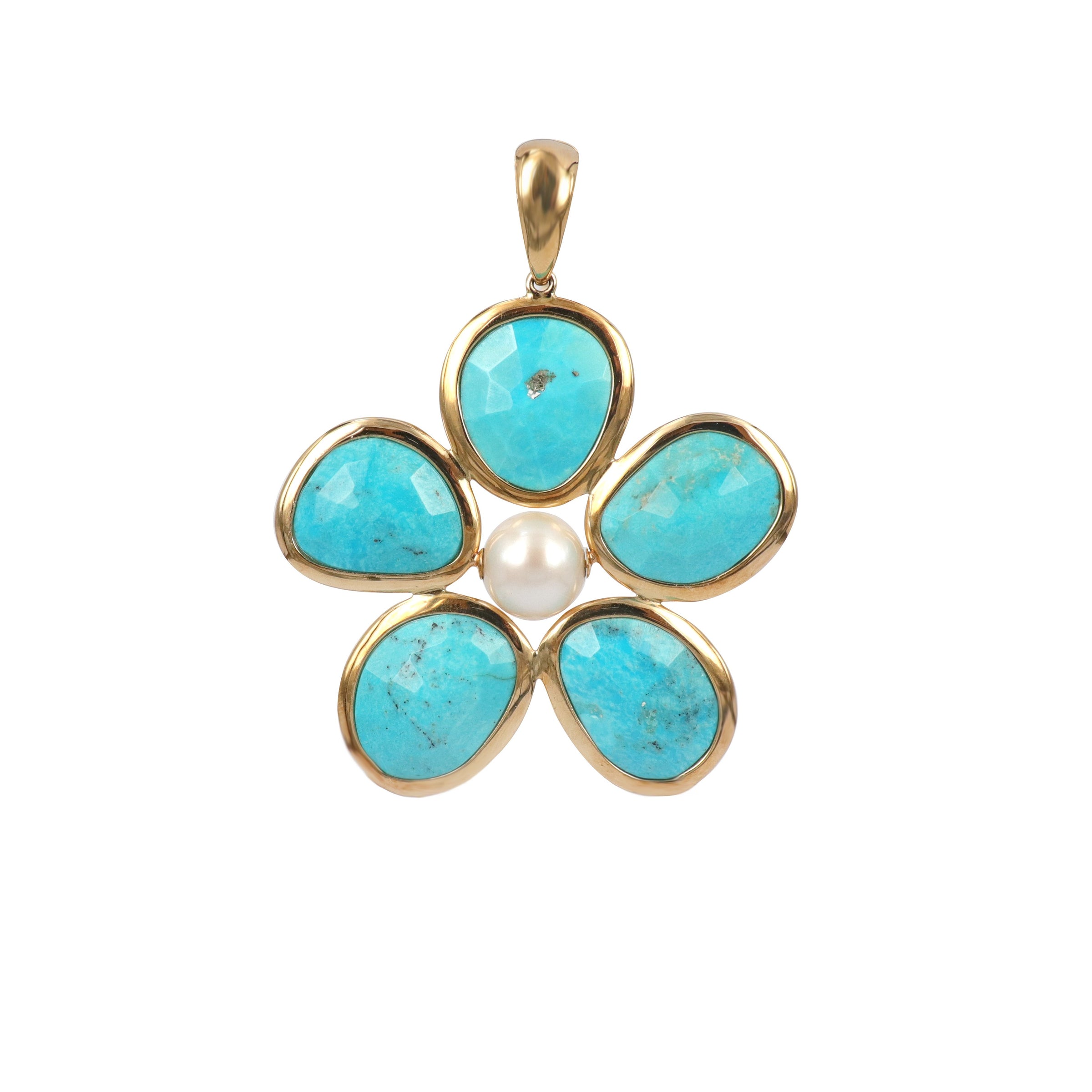 Great statement piece of wearable luxury, this reversible turquoise flower pendant could be worn with a thick long chain in the winter and on a more delicate chain for the summer. Matching turquoise ring available.